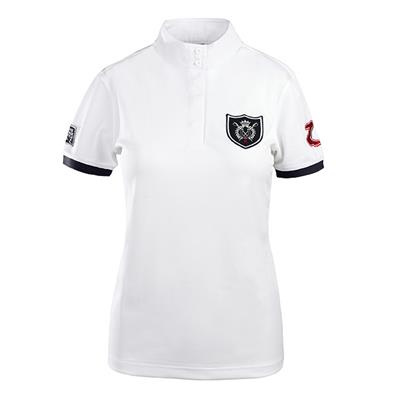 A practical short sleeve competition shirt is comfortable for any style of riding! With a patch on the front and colorful accents, this shirt is fashionable and functional. A low mock collar adds a sophisticated touch with a hidden button neckline for a polished look. The breathable silky soft, durable fabric provides comfort on the warmest days.